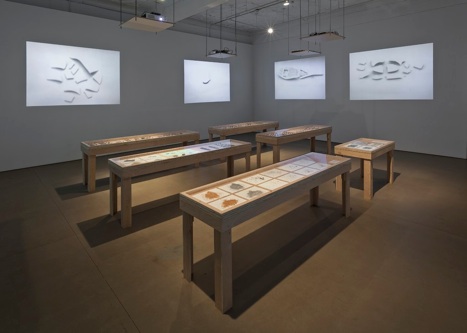 Top image: Installation overview of the gallery, with “The End of the World” videos projected on walls.