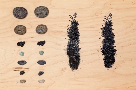Next image: “Souvenirs (Iceland)”, 2012. This image shows a row of rocks I found in Iceland on the left, with a row of copies I made of the rocks seen to the right of the originals. In the middle of the image is a row of gravel and sand from Vik, Iceland, shown with a pile of copies of the gravel and sand.