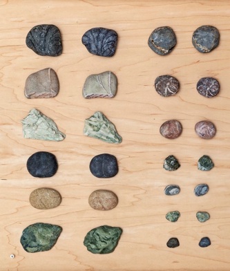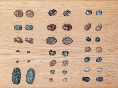 Bottom image, left: “Souvenirs (California)”, 2012. Some more rocks from California in left-side rows, with my stoneware copies in the rows on the right.