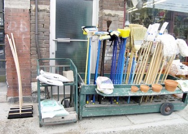 I made several copies of the bent broom by steaming broom handles and bending them, and I put them in a temporary display in front of Ralph’s Hardware on College Street in Toronto.