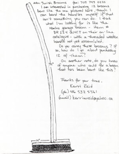 I found this bent broom that my neighbor in Toronto was planning on throwing out. I faxed several broom manufacturers to see if anyone could fix it, but no one agreed to do it. I then also tried see if anyone would consider manufacturing a bent broom, but again, no one could.