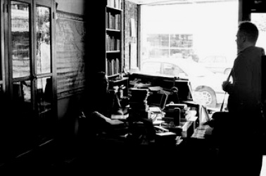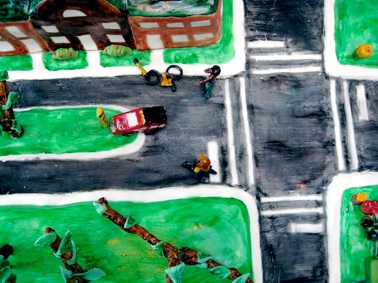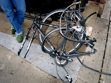 These images show just a few of the encounters we had over the ten days, and the cakes these encounters inspired. The two images to the left show a denturist named Manuel Bentes of the Dundas Denture Clinic on Dundas Street, and the dentures cake I made as a homage to Manuel. Below those images there is a photo of a chance encounter we had on the street with Francisco Alejandri, who had recently survived being hit by a truck on his bike. Beside this photo is a close-up of the cake Sean Frey made of the accident, and the bottom two photos show Harrell in The Monkey’s Paw - a bookshop I used to work at - and his stack-of -books-cake. (Sean Frey took the black and white photo, and Harrell Fletcher took the photos of Manuel Bentes and Francisco Alejandri and his bike.)