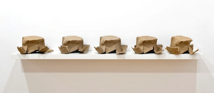 I found this crumpled box on Spadina Street in Toronto and made five copies of it in its broken form. The original box was used to make a plaster piece mold, and was then mulched up with other bits of cardboard to be pressed into the mold to make the copies. I tried to sell one of the copies on eBay, but no one bid on it.