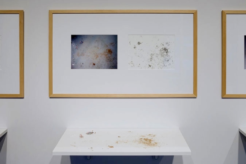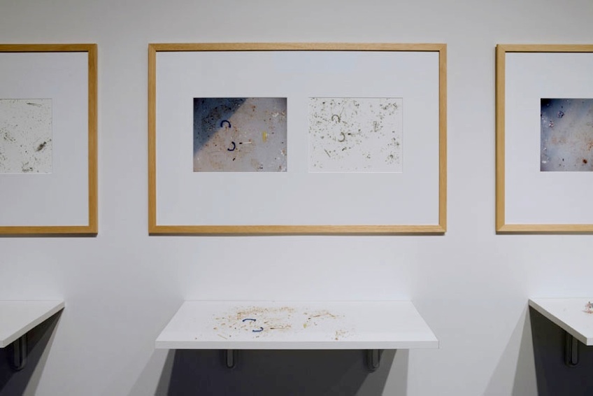 Each piece consists of an 8 x 10” photograph of the original found pile of dust and debris, an 8 x 10” pen on paper drawing of the pile, and a shelf displaying the original pile reconstituted into its found form. Installation shots by David Miller.