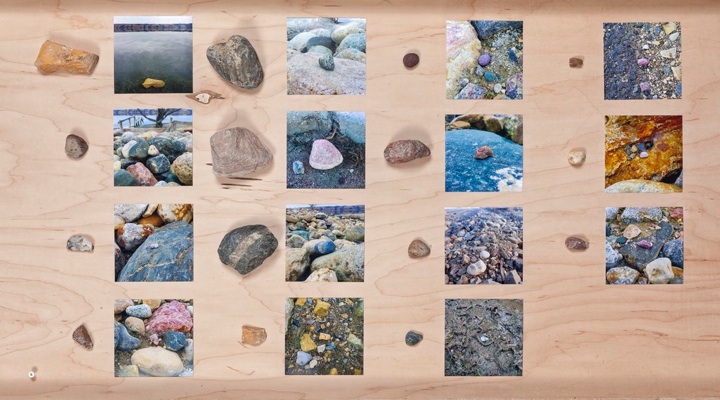 Four rows of rocks originally found in Manitou Beach, Saskatchewan, shown alongside photo documentation of the stoneware copies I made of each rock and left out where the originals were found.