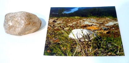 Next Image, Right: One of my copies of a rock, shown beside a photo of where I put the original rock back. (This one went on top of the Dome above Dawson City.)
