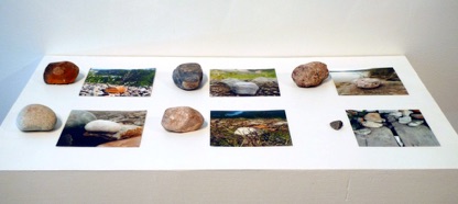 Next Image: A shelf displaying six copies of rocks I found and took away with me when I first went to Dawson City in 2010, shown alongside photos I took of the original rocks put back, roughly where they had originally been found, when I went back to Dawson City for this show in 2013.