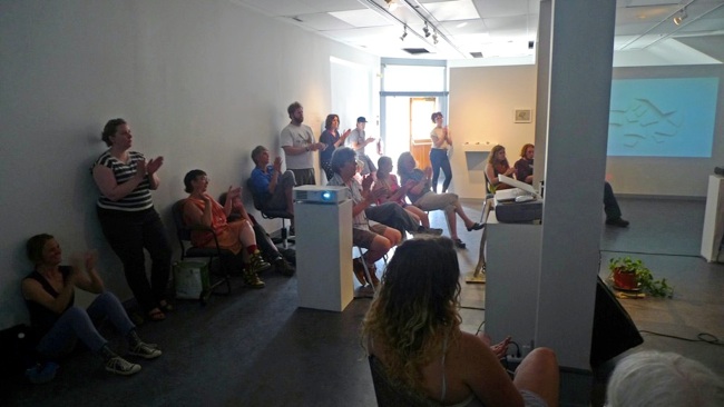While in Dawson City, Tyler and I performed a free concert in the gallery as The Department. Here you can see the audience, part of Tyler’s kinetic sculpture ‘Watering Wheeler’, and part of my projection ‘The End of the World’.