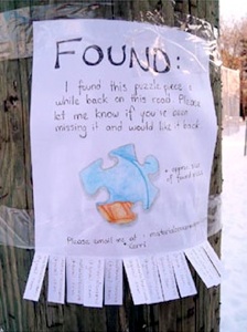 I found a piece of a puzzle on a sidewalk in Toronto, and I attempted to return it to its owner by making a “found” poster and posting it on the street where I found the piece. No one ever responded, though, and the poster was completely gone after just a few days.