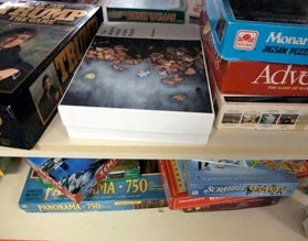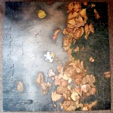 In 2009 I painted a 35 x 35” acrylic painting depicting how I found the puzzle piece, and I cut a hole in my painting for the original found piece to fit into, thus completing the puzzle. I then cut up the painting in to puzzle pieces, put it in a box, and left it in a thrift store in Lethbridge, Alberta. Documentation of this was shown in Small Things Forgotten, a project for the Southern Alberta Art Gallery’s “Into the Streets: Avenues for Art” 2009 exhibition series.