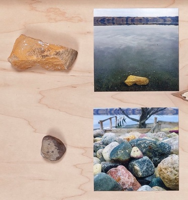 Bottom image, right: “Souvenir Return (Manintou Beach)”, 2012. This image shows two rocks I originally found in Manitou Beach, Saskatchewan, shown alongside photos of the copies I made of the rocks and left back in Manitou Beach where I found the originals.