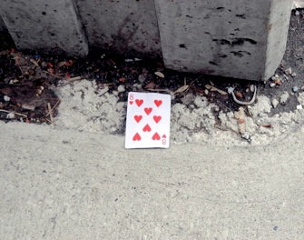 I found an eight of hearts playing card on a sidewalk in Toronto, and I made a hand-drawn (pen on paper) deck of cards to complete it. I left this completed deck of cards in a thrift store in Lethbridge, Alberta.