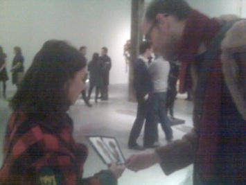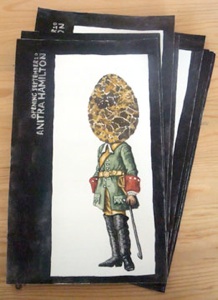 I was asked by Anitra Hamilton to make a project for her Satchel Gallery in the fall of 2009. As this was a time when she was going to have several exhibitions of her own, I decided to paint a set of gouache on paper copies of one of her exhibition invites. The original invite is to the immediate left, and my copies are beside and below it. Also pictured is a Satchel Gallery cell-phone-action shot, taken by Sarah Robayo-Sheridan.