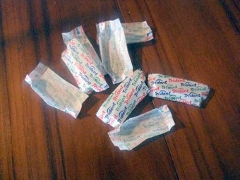 After installing my project at the Southern Alberta Art Gallery - see here for more details - I found a Trident gum wrapper on the floor of the gallery that I had overlooked while gathering dust and debris to work with. I kept the gum wrapper and took it home to Toronto with me, and a few months later I drew 50 pen on vellum copies of it for the exhibition Air Conditioned Jungle at Diaz Contemporary, curated by Gregory Elgstrand.