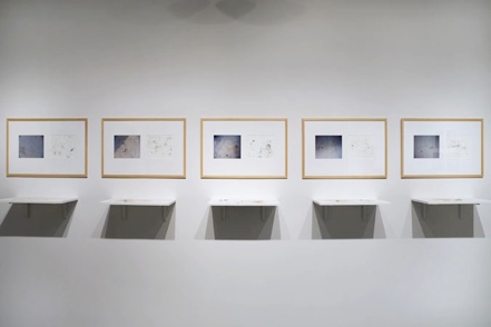 Each piece consists of an 8 x 10” photograph of the original found pile of dust and debris, an 8 x 10” pen on paper drawing of the pile, and a shelf displaying the original pile reconstituted into its found form. Installation shots by David Miller.