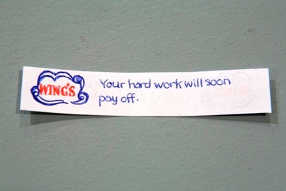 While working away on my project “Things Fall Apart”, I ordered take-out from a Chinese food restaurant across the street from where I live one night. My fortune said “Your hard work will soon pay off”, which I thought was nice timing.